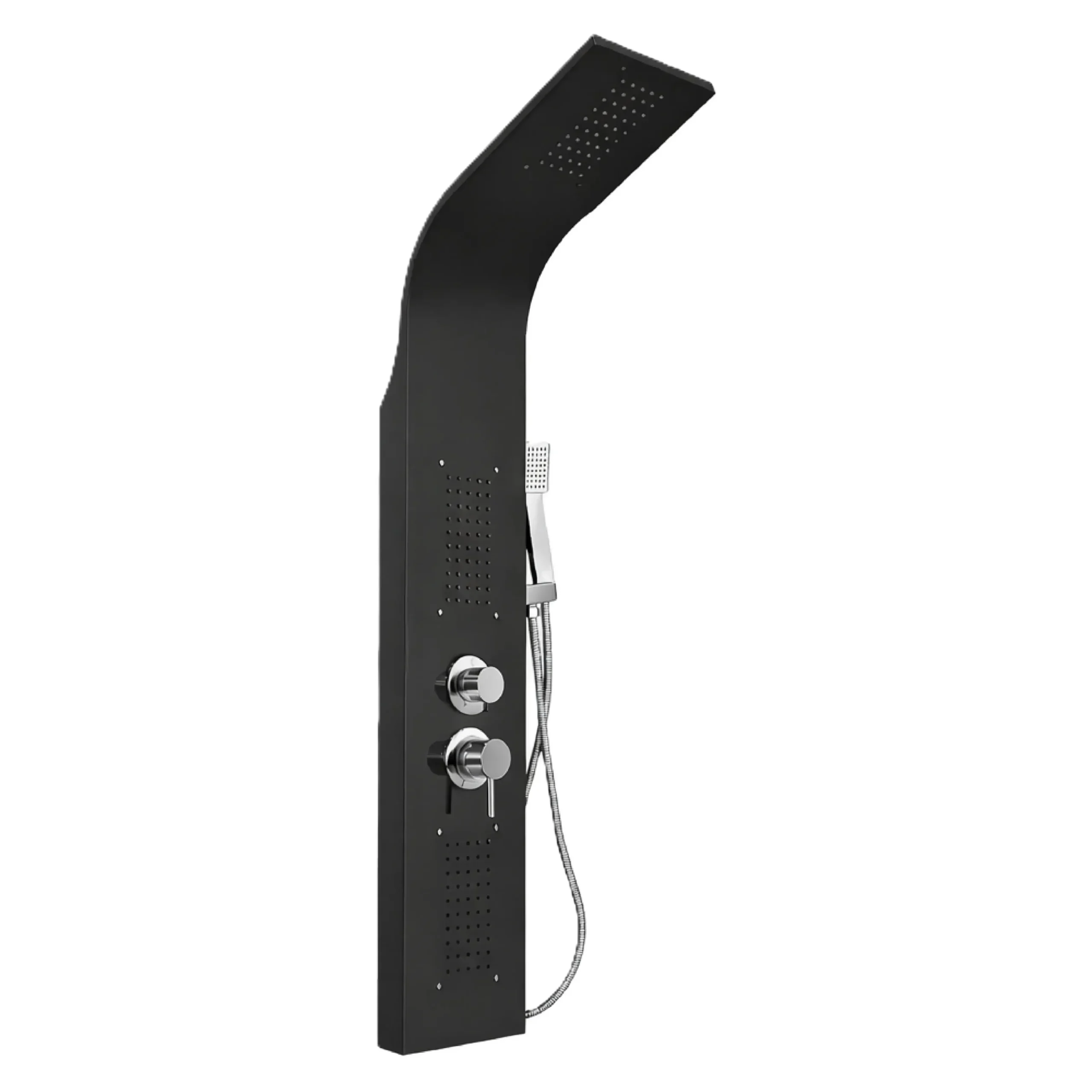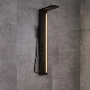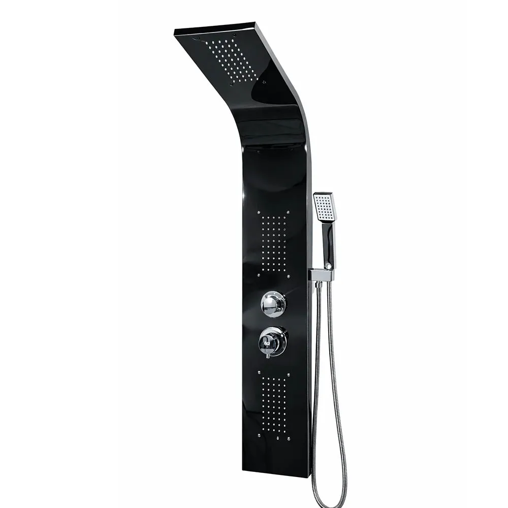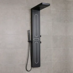Black panel with rainfall + 2x jets and hand shower. Sleek and minimal for modern spaces. 1200mm in height and 220mm in width. (1 Year Warranty)