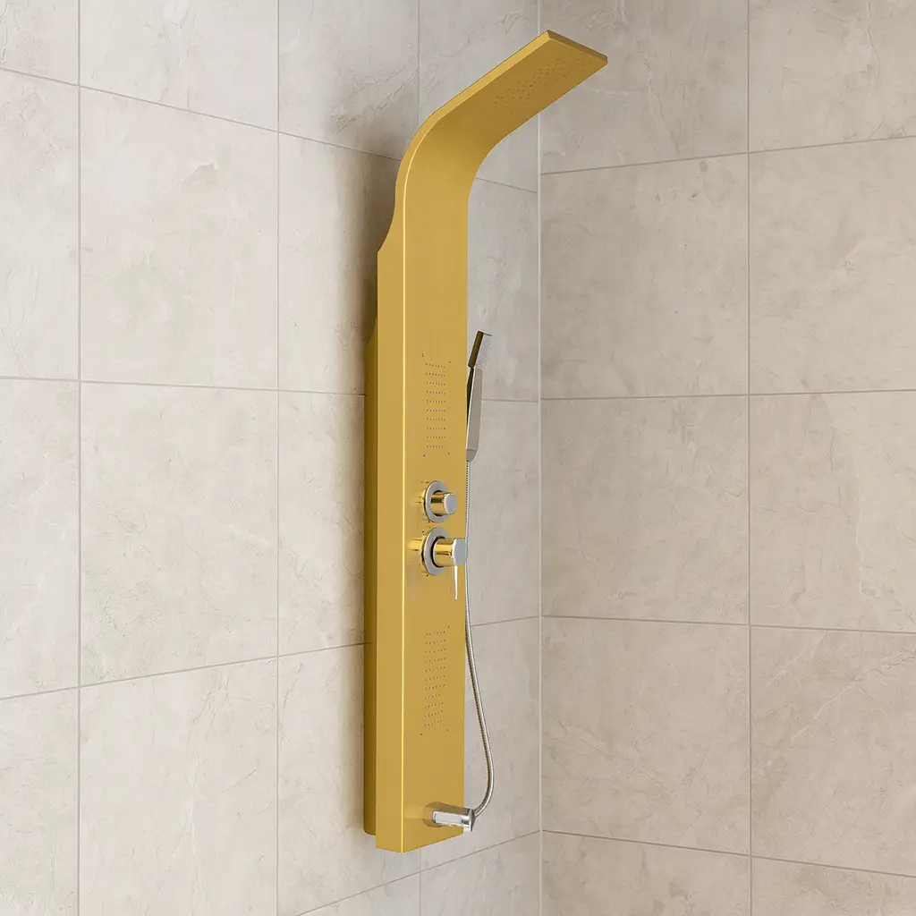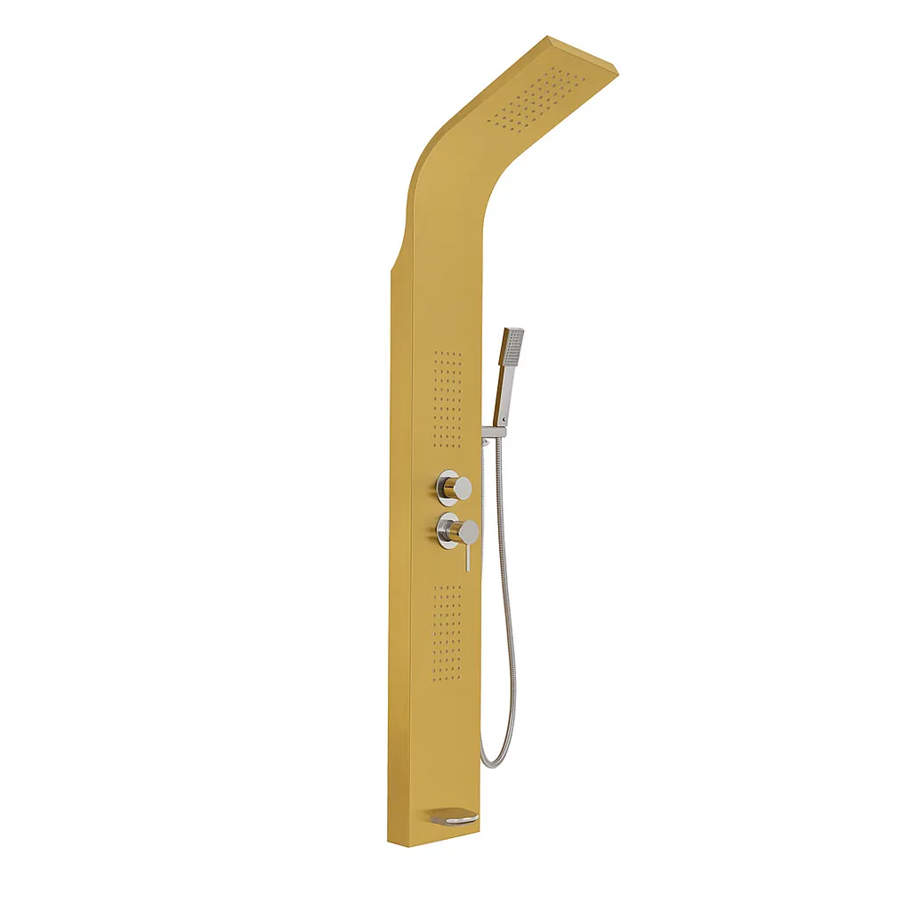 Gold 4 function shower panel. A neutral, stylish choice for contemporary bathrooms. Spout + 2x jets + waterfall + rainfall + hand shower. 1500mm in height and 220mm in width. (1 Year Warranty)