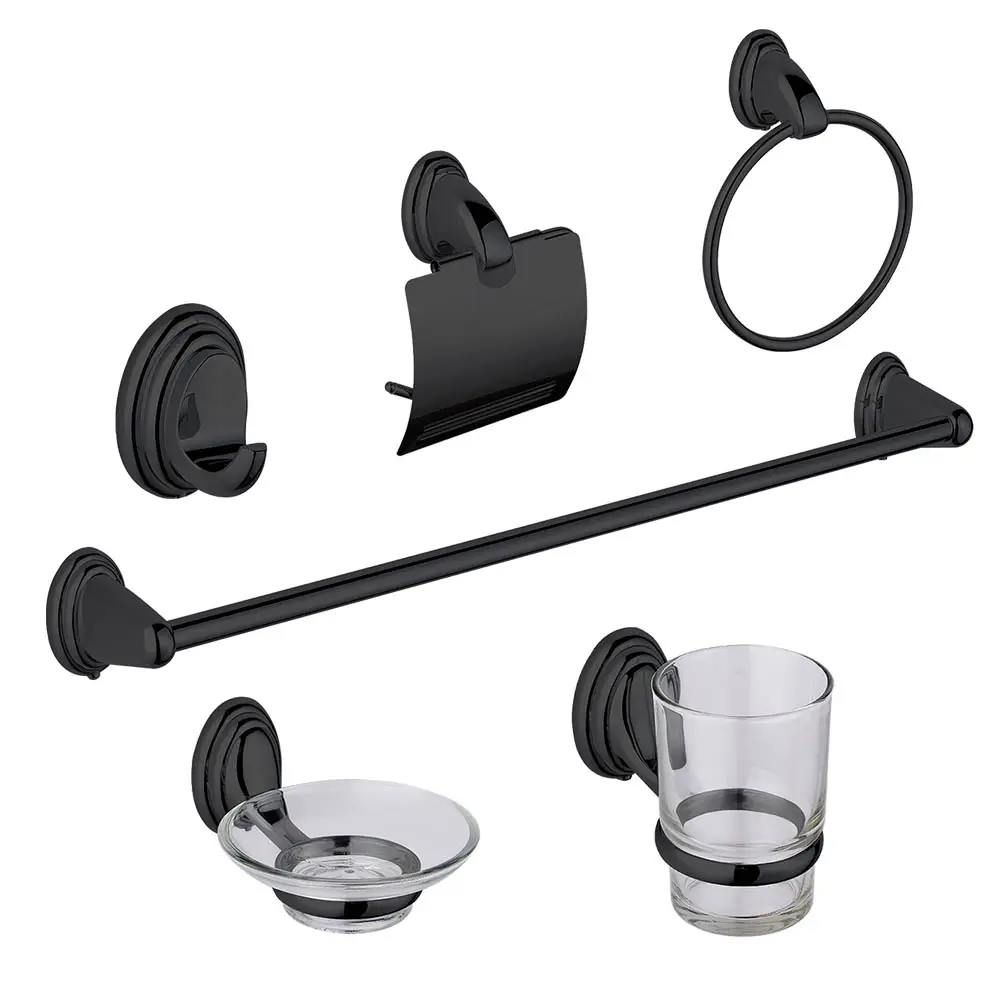 Modern 6-piece bathroom accessory set in matte black, designed to add a sleek and coordinated finish to contemporary bathrooms.