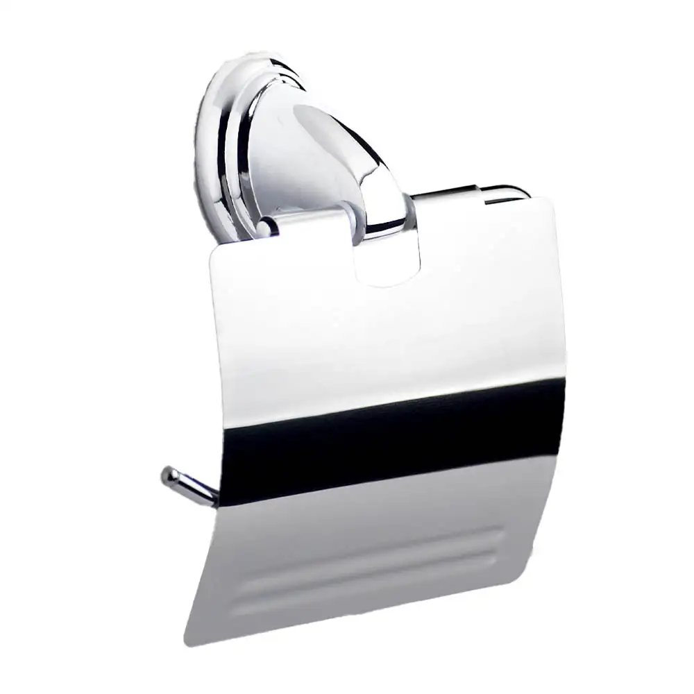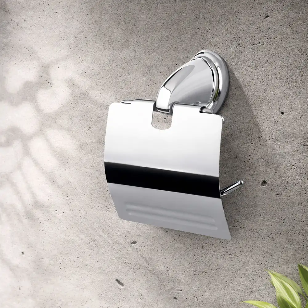 A polished chrome toilet paper holder with a slim, practical design, offering a clean and modern look for contemporary bathrooms.