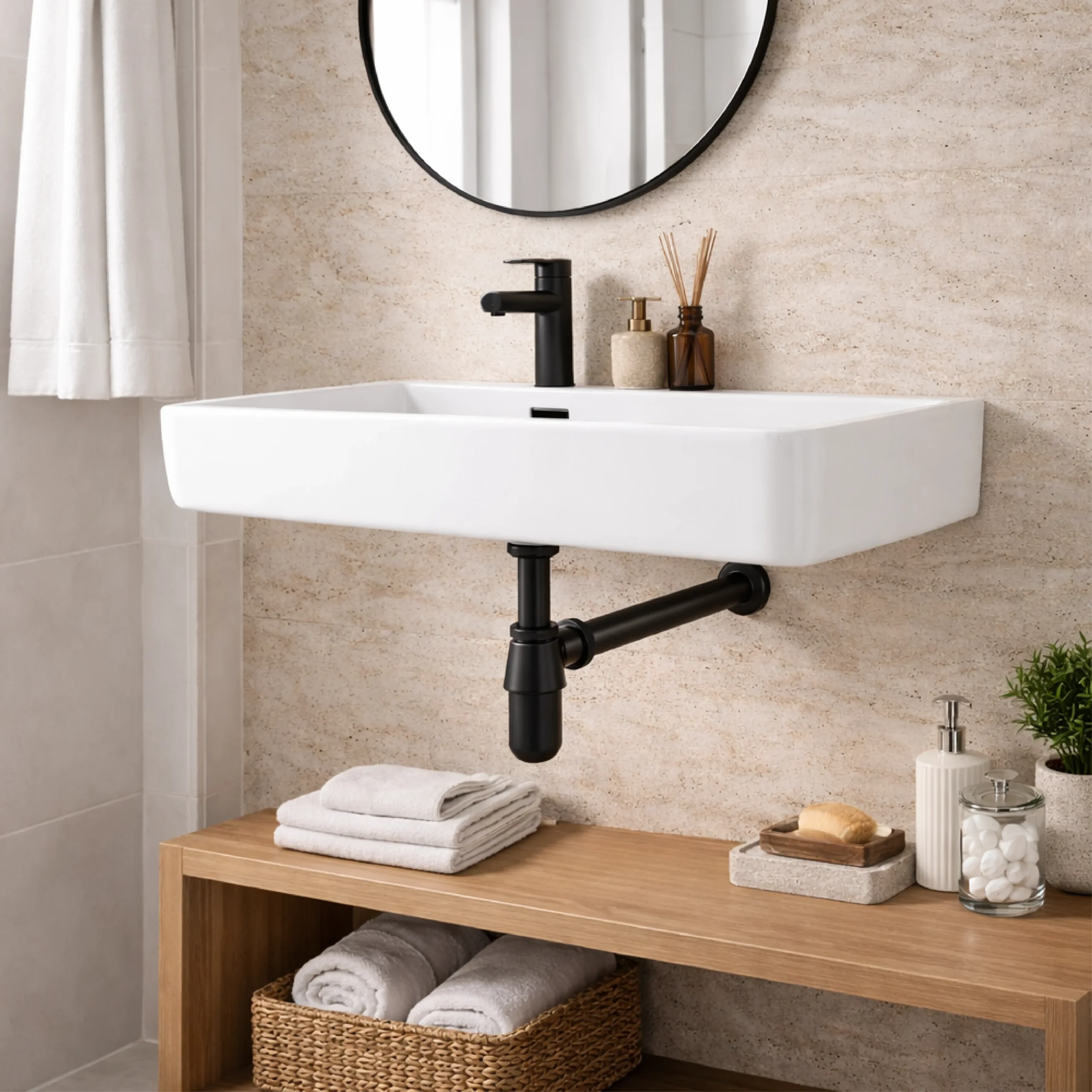 Matte black bottle trap adds subtle contrast and modern flair beneath any basin