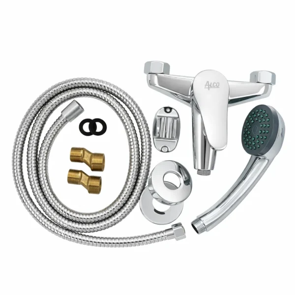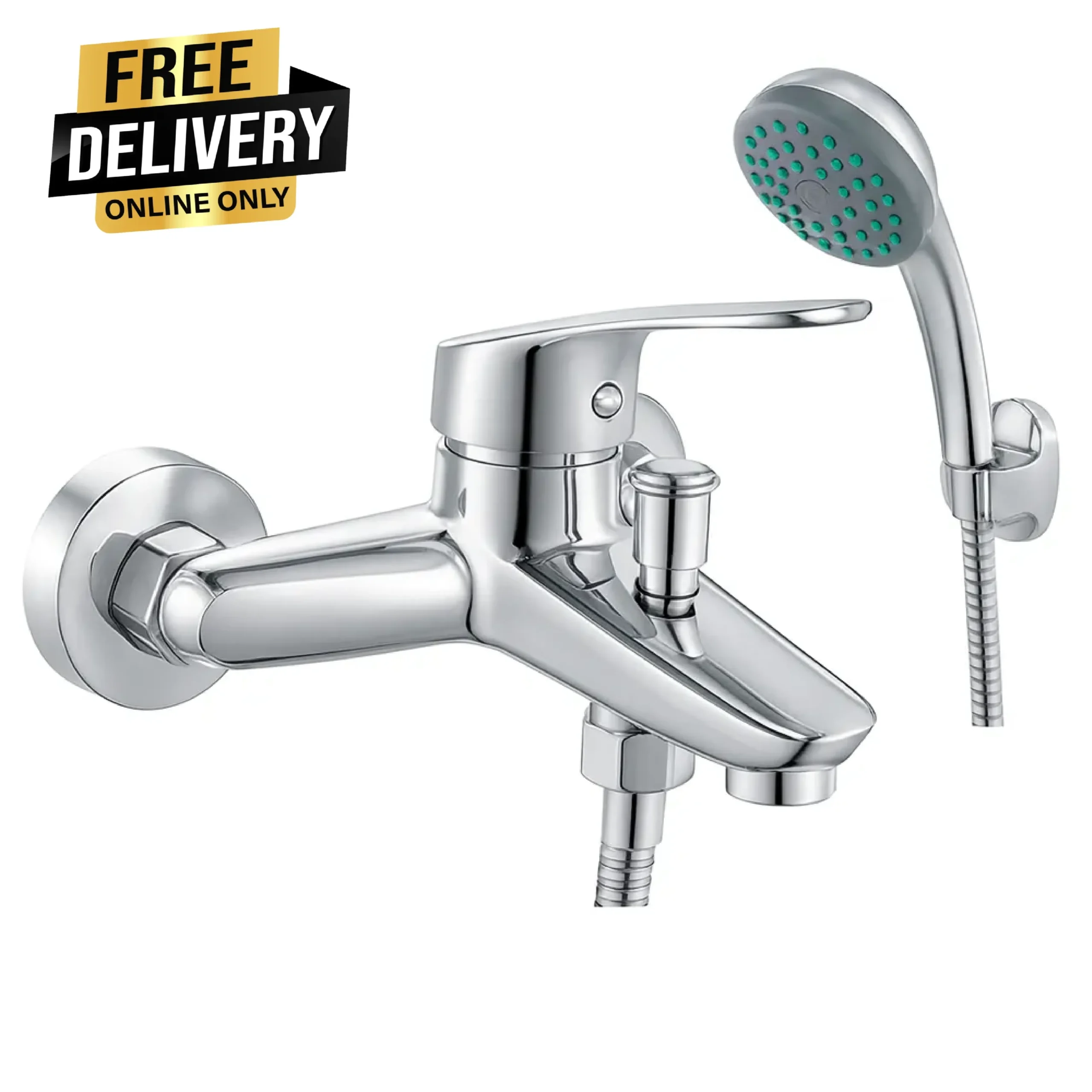 A chrome bath mixer with hose featuring the Tivona Arc design, offering smooth water control with a clean, modern finish for contemporary bathrooms.