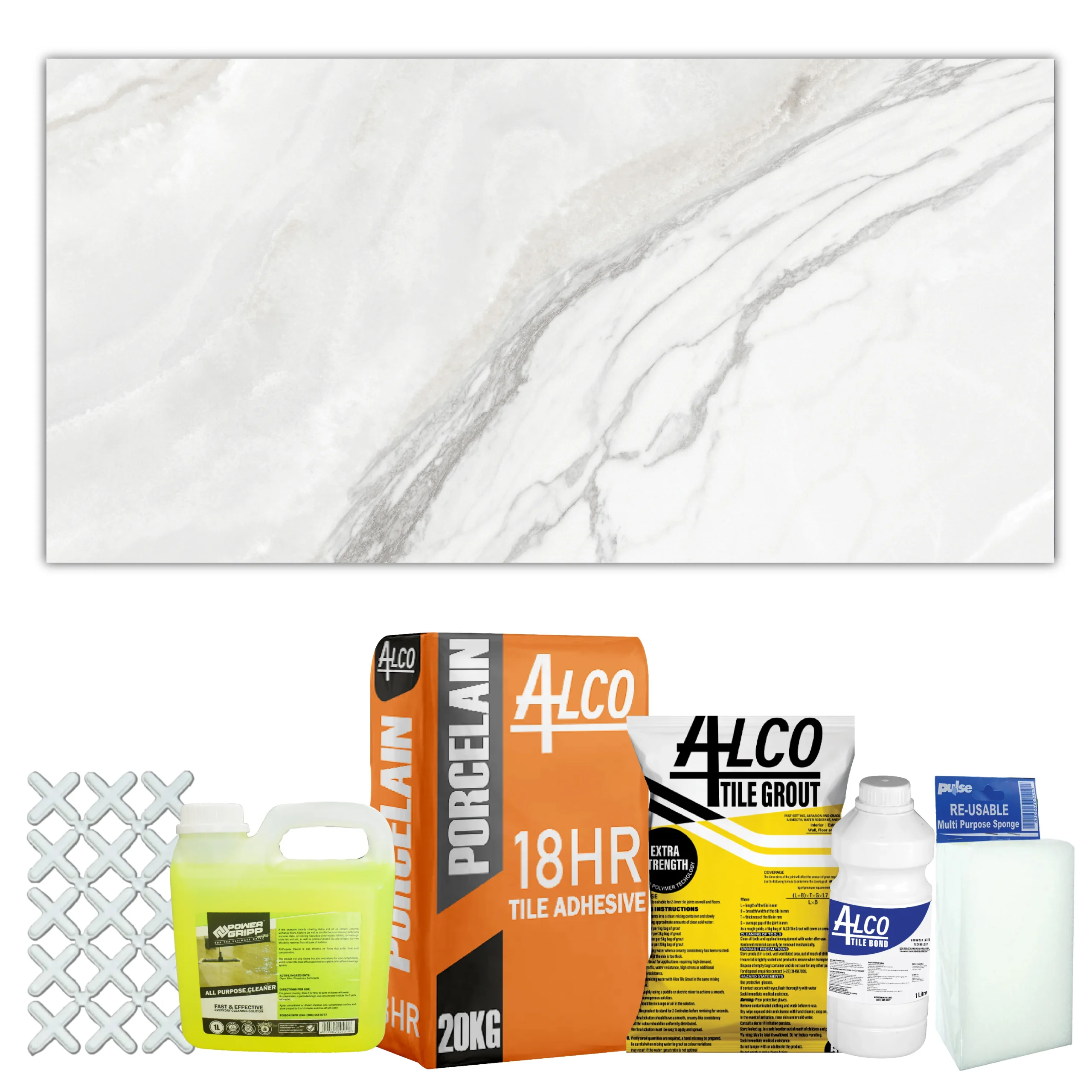 One Combo covers 10.08 square meters with 7 boxes. Comes complete with adhesive, bonding liquid, grout, and spacers — everything you need for a flawless finish.