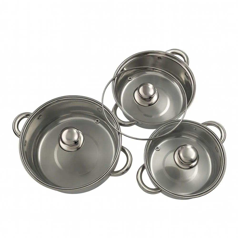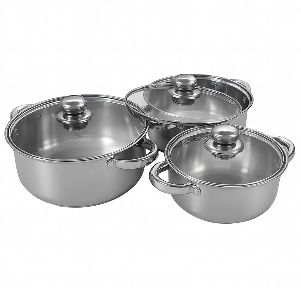6-piece stainless steel cookware set with 16cm, 18cm, and 20cm casseroles and glass lids, ideal for everyday cooking.