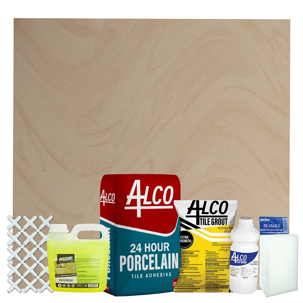 One Combo covers 10.08 square meters with 7 boxes. Comes complete with adhesive, bonding liquid, grout, and spacers — everything you need for a flawless finish.