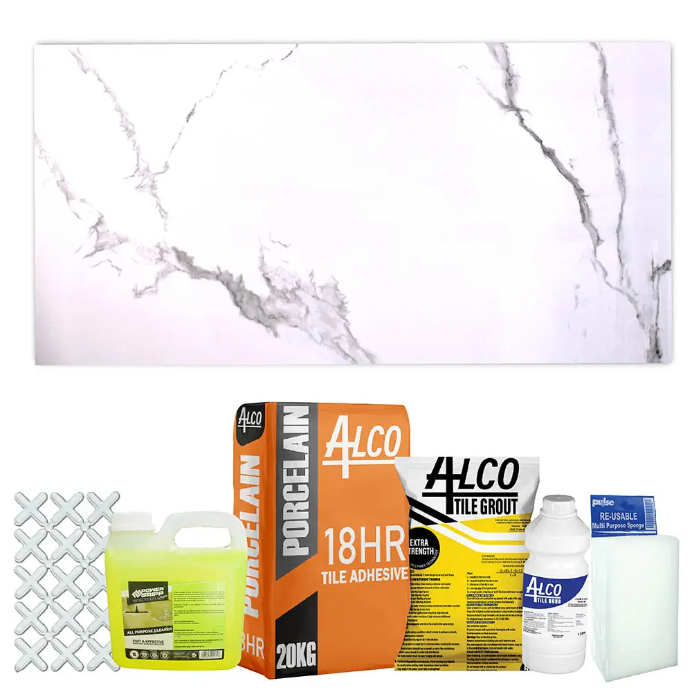 One Combo covers 10.08 square meters with 7 boxes. Comes complete with adhesive, bonding liquid, grout, and spacers — everything you need for a flawless finish.