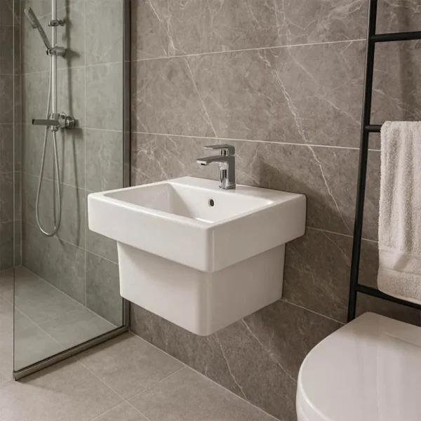 A practical wall-hung basin with a clean, simple design, ideal for everyday bathrooms where durability and functionality matter.