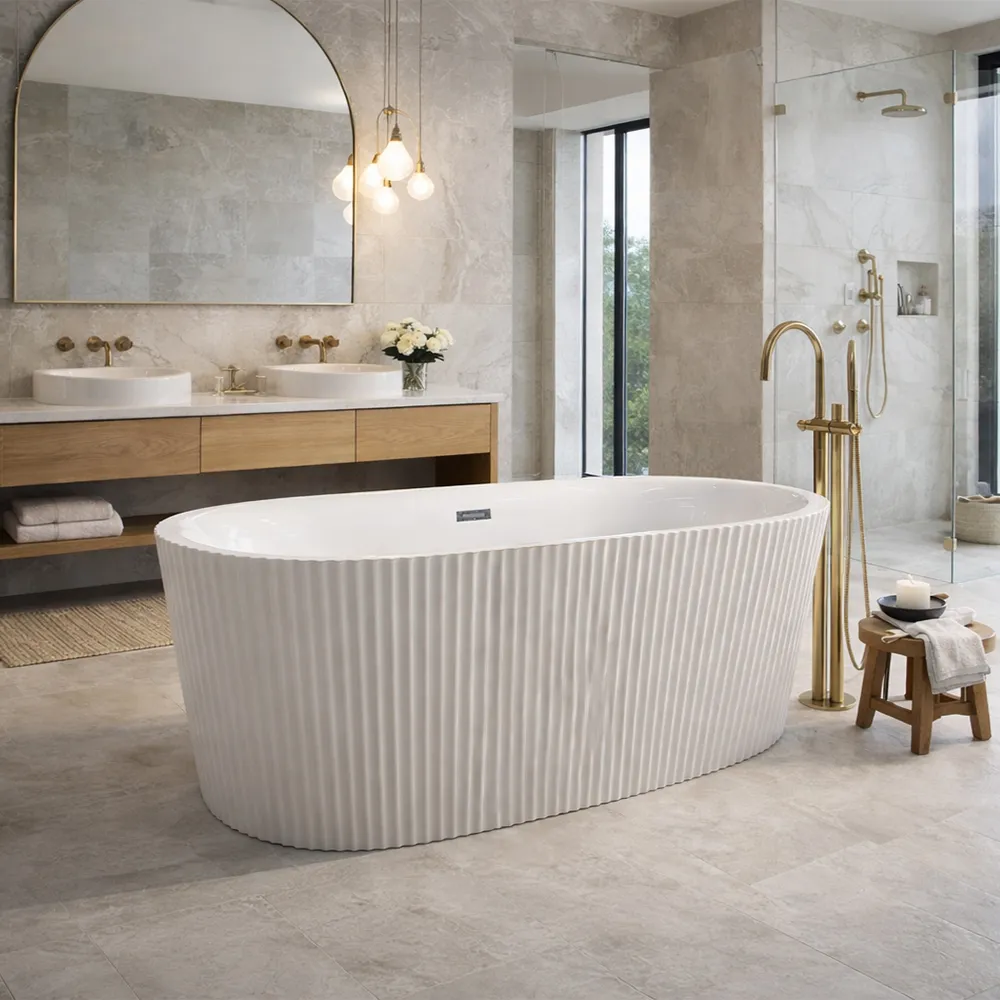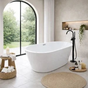 Sleek freestanding bath with a minimalist white finish suitable for contemporary spaces.