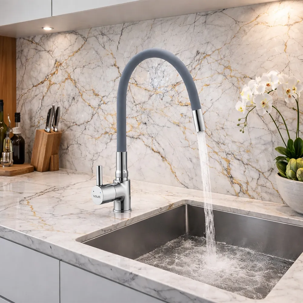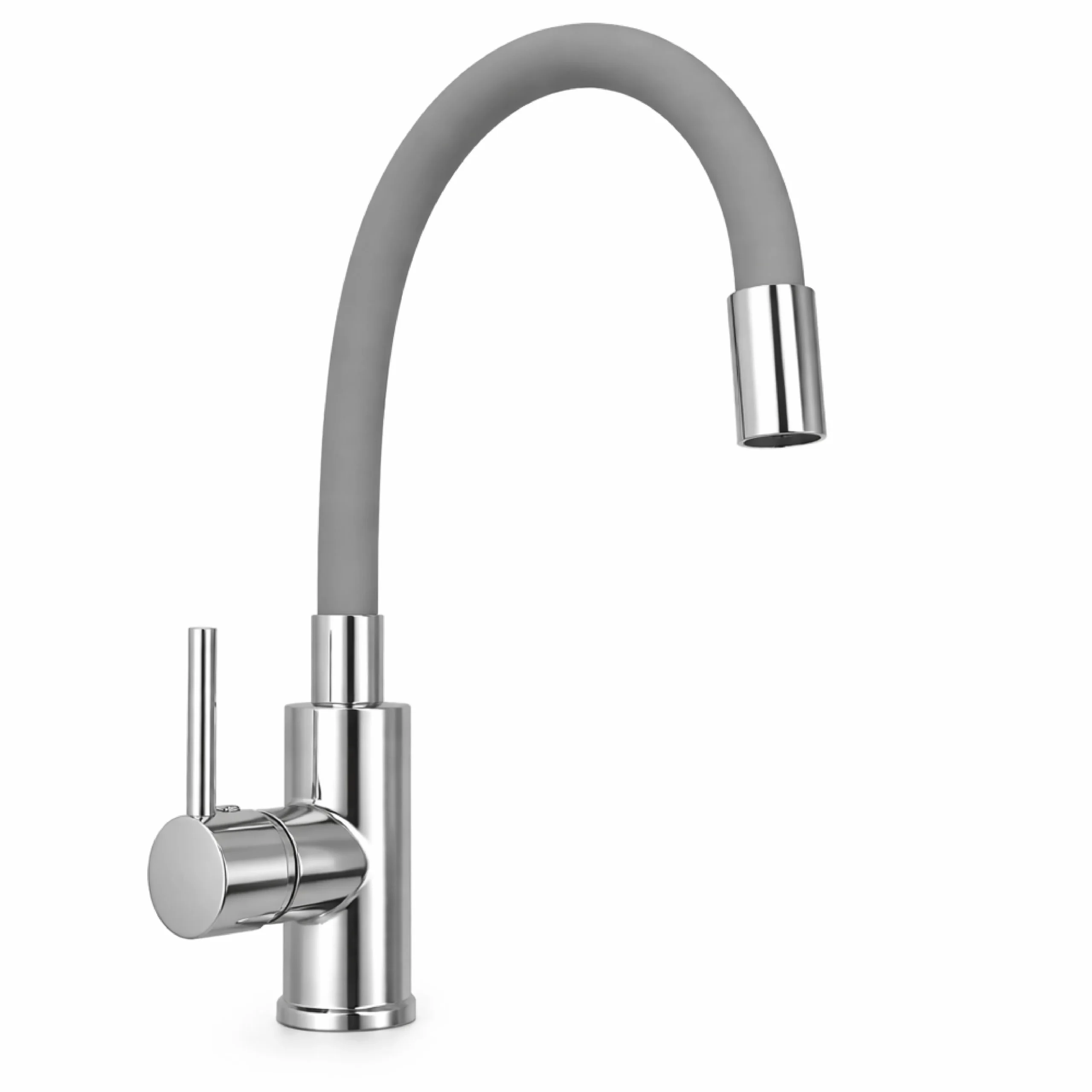 A flexi hose sink mixer featuring a sleek deck-mounted design in a modern grey finish, offering flexibility and ease of use for everyday kitchen tasks.