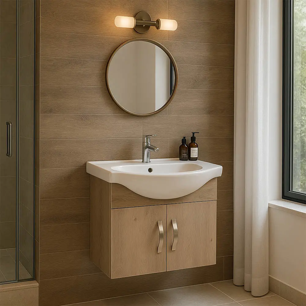 450×440×180 mm basin with wall‑hung cabinet (425×550×335 mm). Crisp white finish with practical everyday storage.
