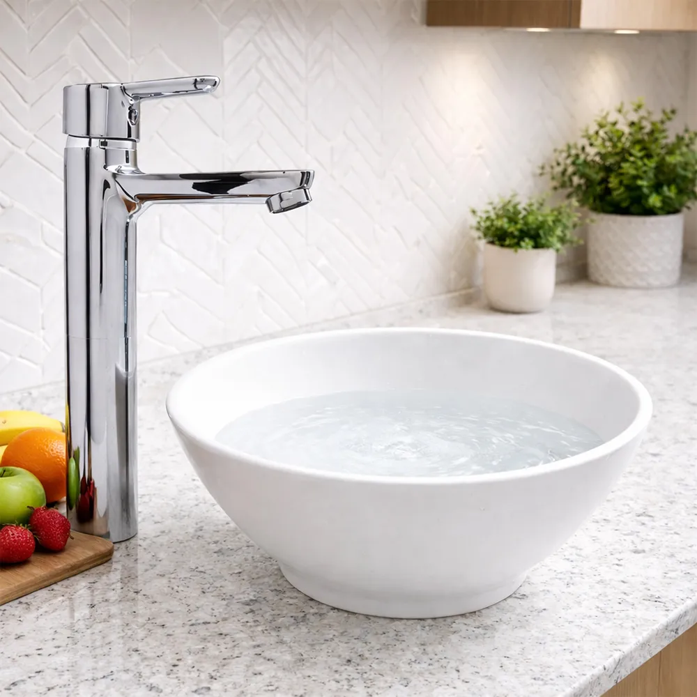 The Hazel Basin & Mixer Combo pairs the Marina basin mixer with the Hazel tabletop basin, creating a fresh, modern look that suits contemporary bathroom spaces.
