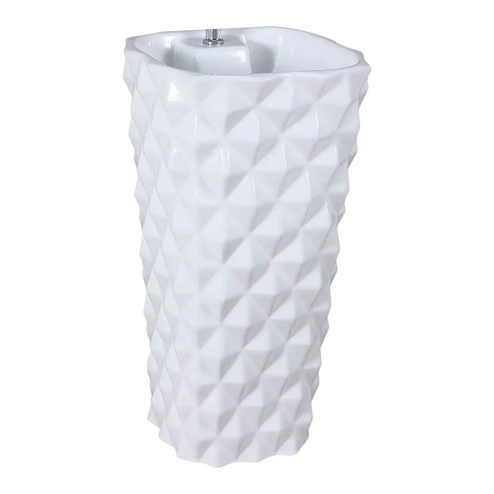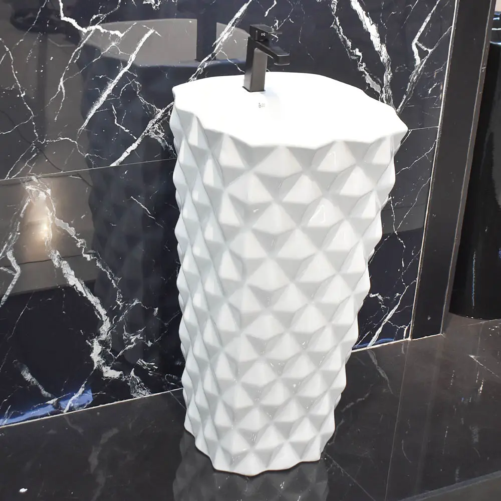 Featuring a unique hexagonal shape, this freestanding basin in white is both geometric and timeless, adding personality to contemporary bathrooms.