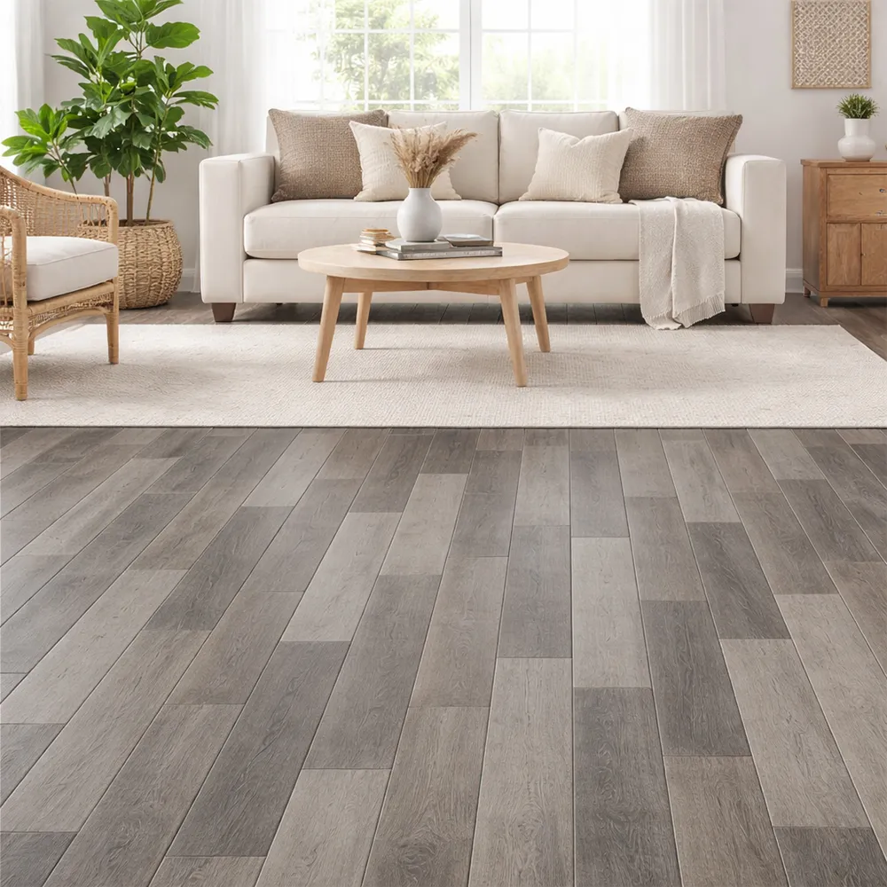 Durable laminate flooring offering a smooth modern finish sized 1220mm by 200mm