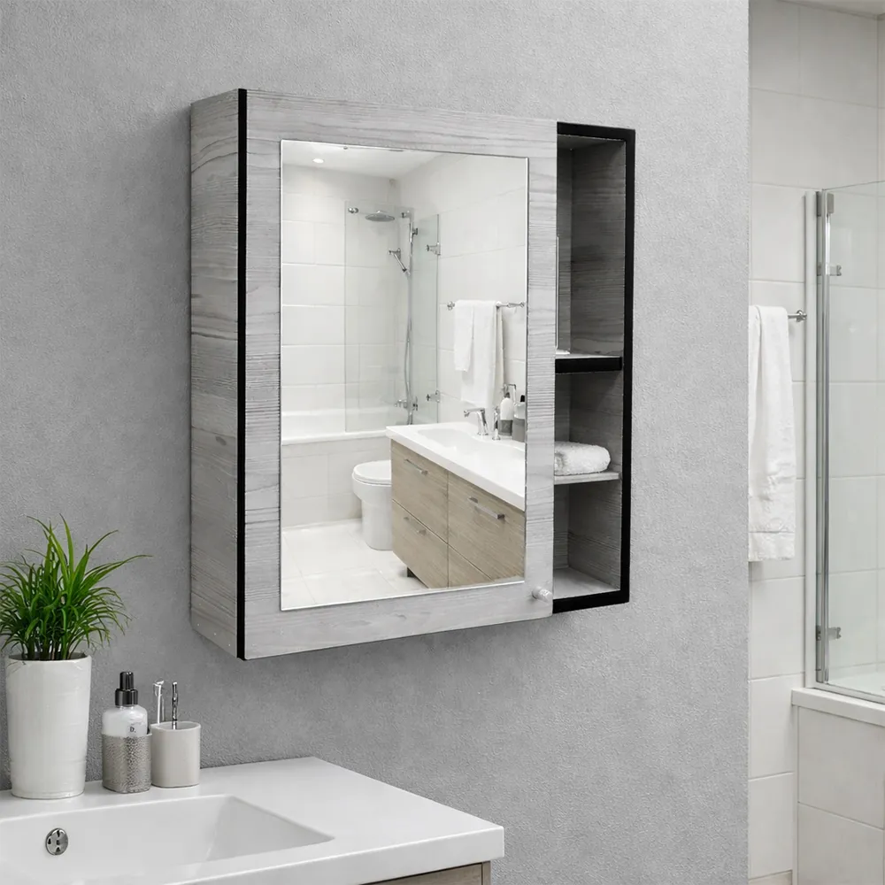 A compact mirror cabinet combining a clean mirrored front with practical side storage, ideal for keeping bathroom essentials neatly organised in modern spaces.