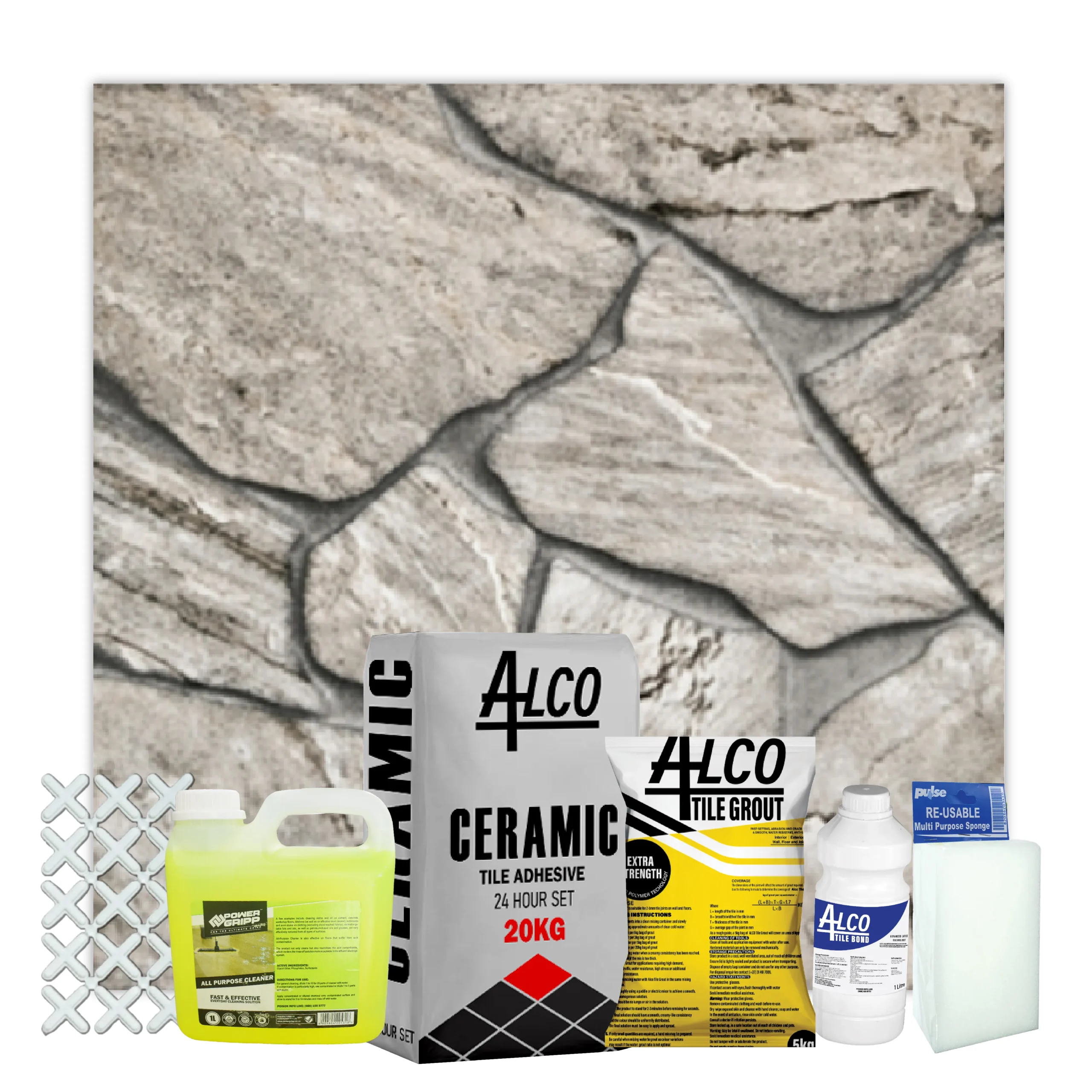 One combo covers 9 square meters with 4 boxes of tiles, plus adhesive, grout, bonding liquid and spacers for a stylish matt finish.