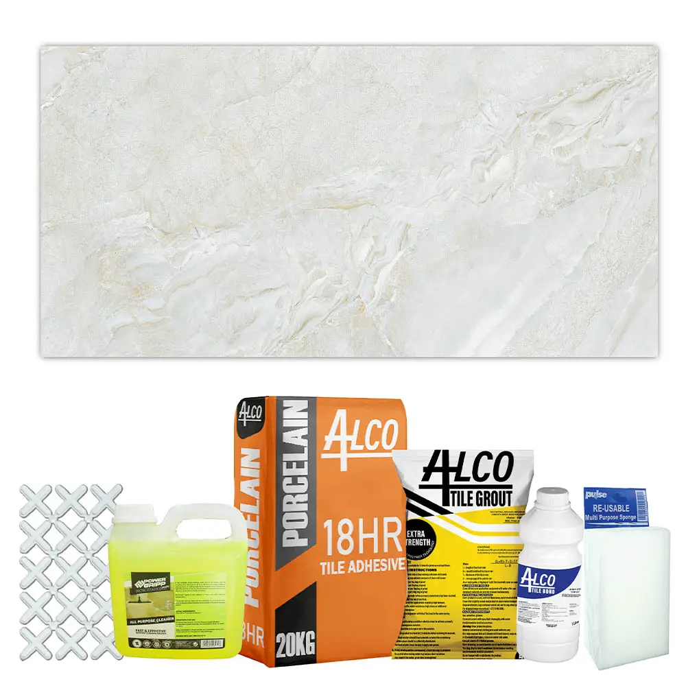 One Combo covers 10.08 square meters with 7 boxes. Comes complete with adhesive, bonding liquid, grout, and spacers — everything you need for a flawless finish.