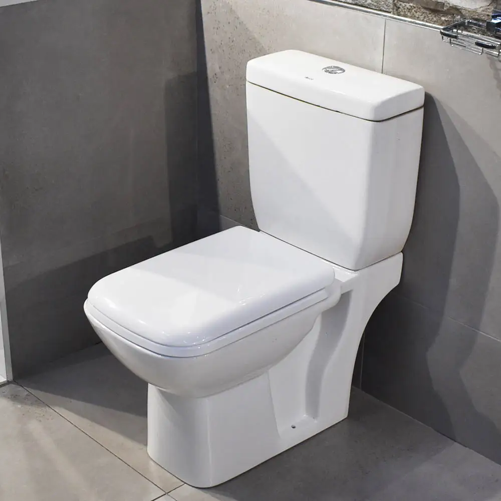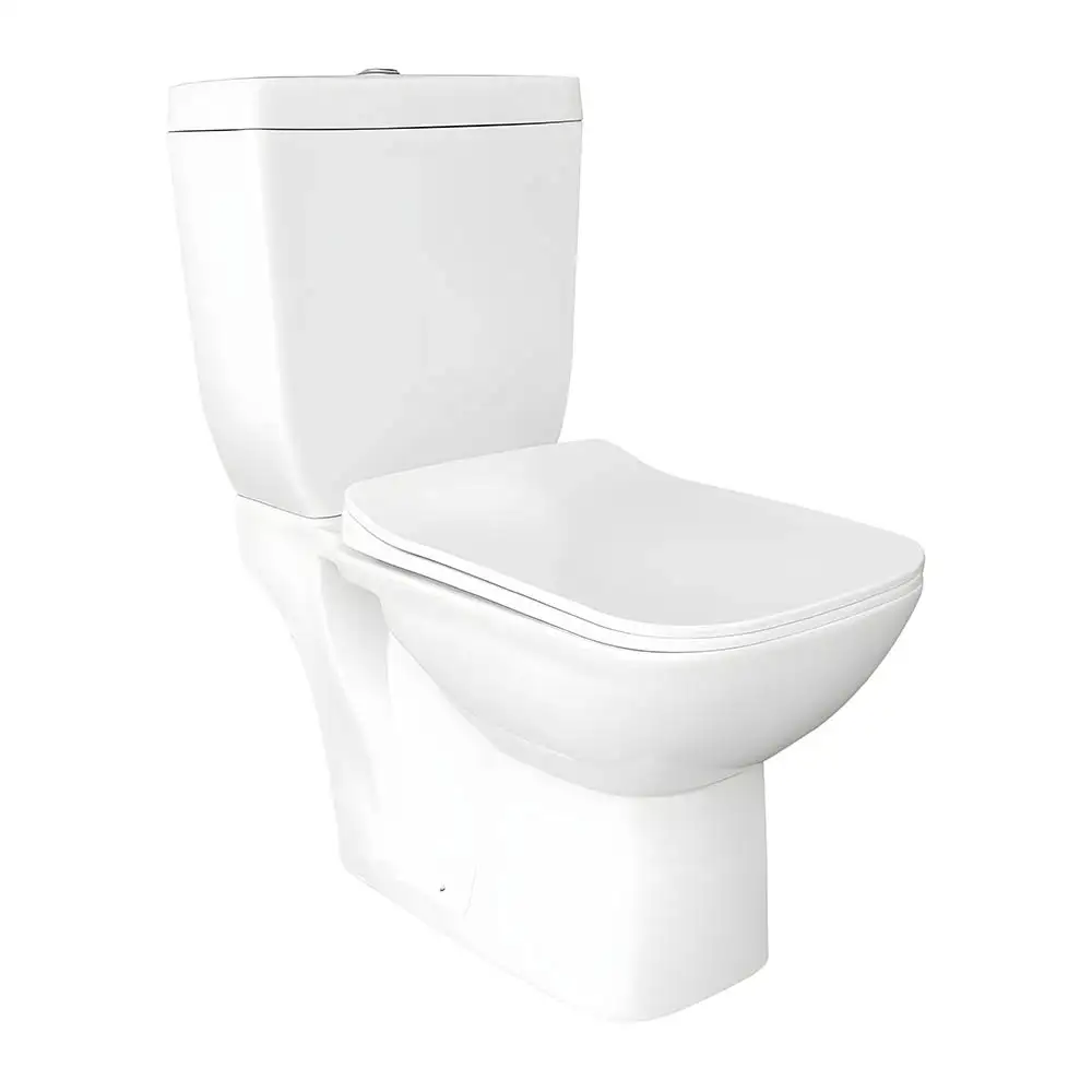 Modern rimless design close-coupled toilet, complete with flush mechanism and toilet seat for a complete ready-to-install package.
