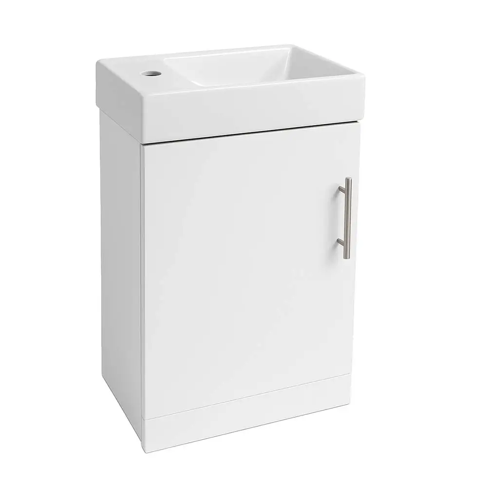 A compact white cabinet and basin combo designed for modern bathrooms, offering a clean look with practical storage for smaller spaces.