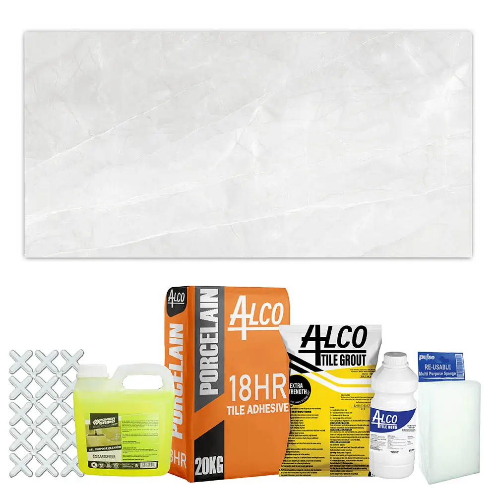 One Combo covers 10.08 square meters with 7 boxes. Comes complete with adhesive, bonding liquid, grout, and spacers — everything you need for a flawless finish.
