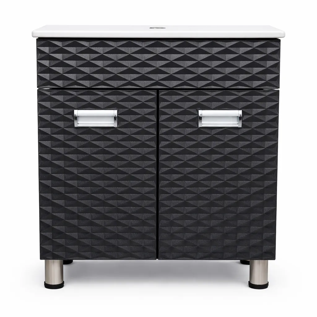 Compact and stylish vanity with carved wood-look finish, chrome handles, and a white basin top—perfect for modern bathrooms and guest spaces.