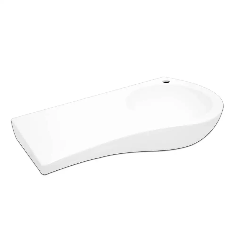 A unique curved basin with an extended shelf design, measuring 74cm x 30cm x 15cm for a sleek, space-saving and functional bathroom feature.
