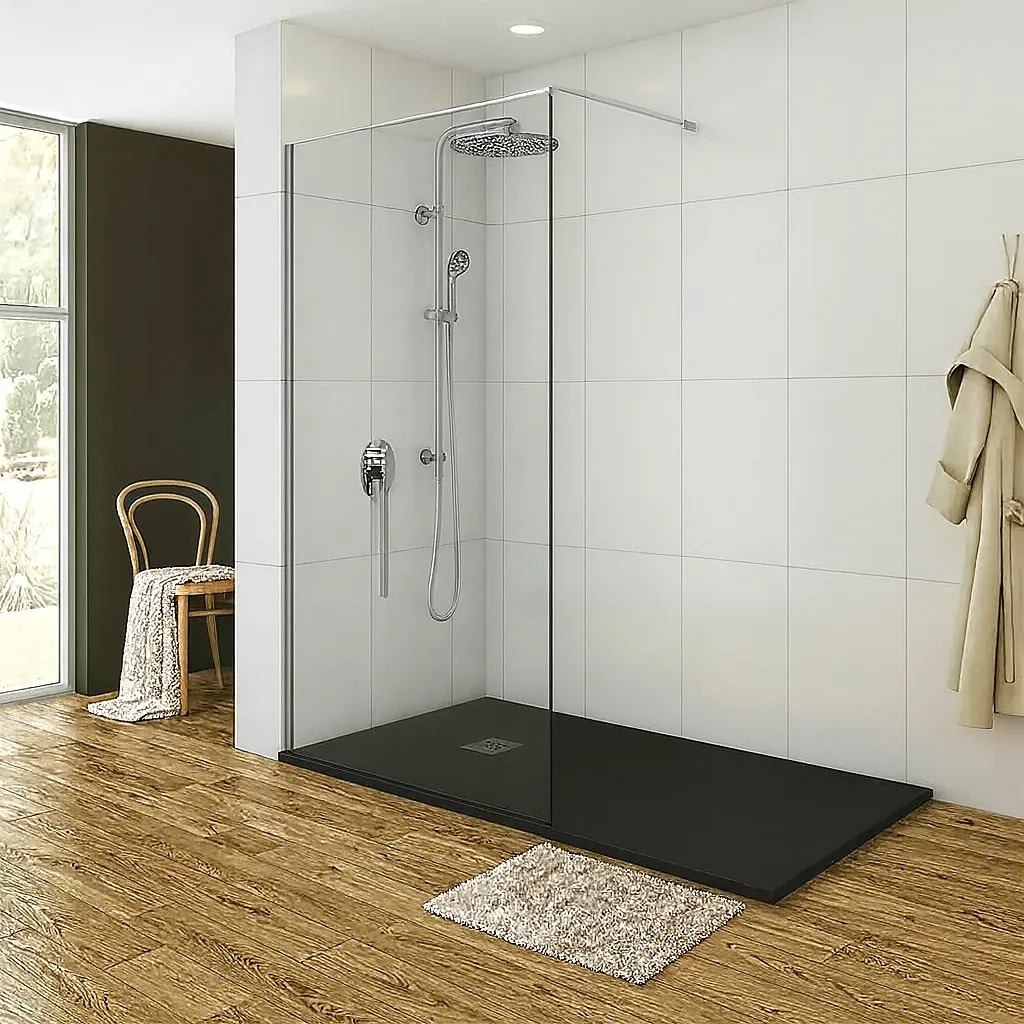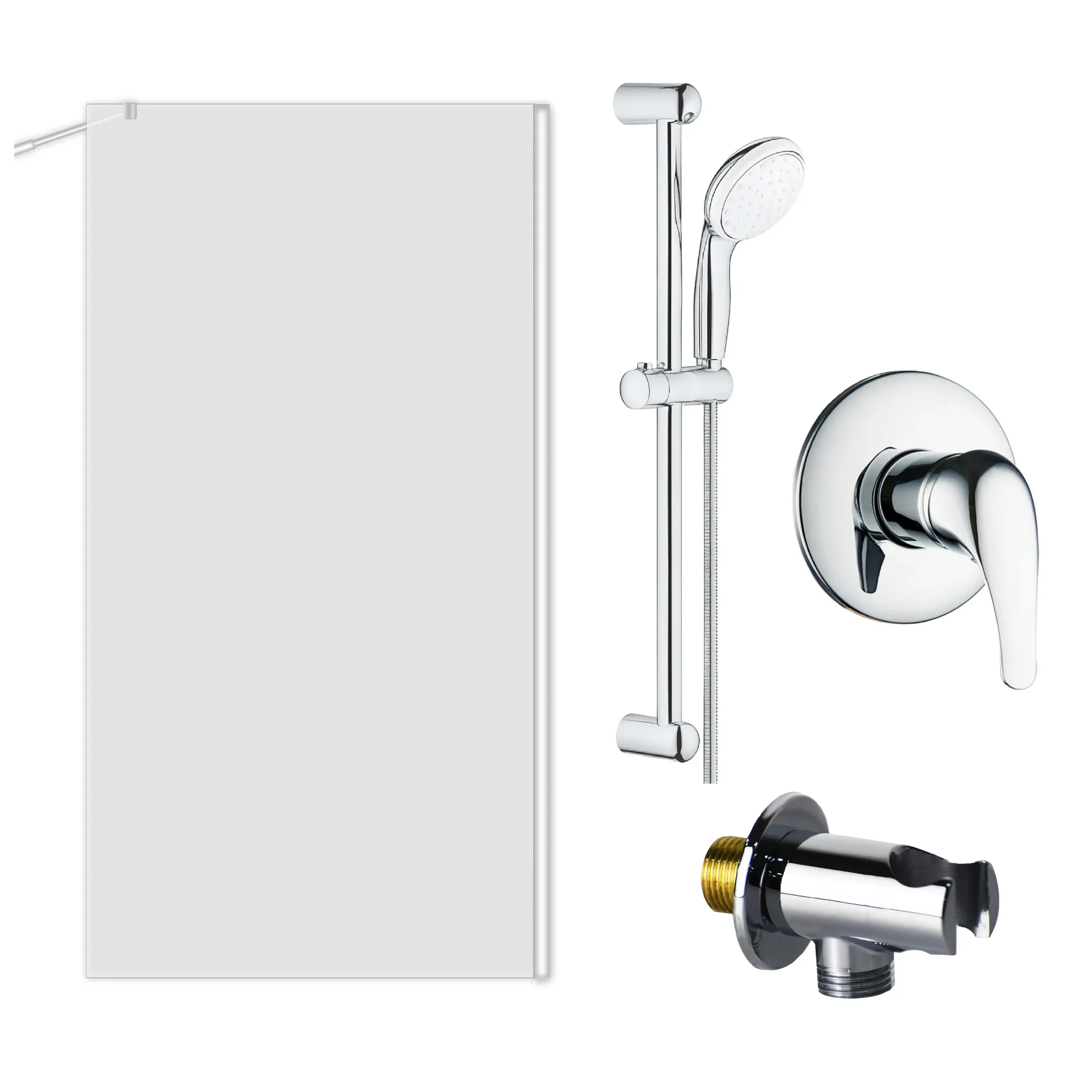 Clear View Shower Screen 900mmx2000mm in size with a 6mm thickness, Aquavit Chrome Shower Rail, Chrome Shower mixer and Chrome Shower Outlet backed by a 5 year warranty.