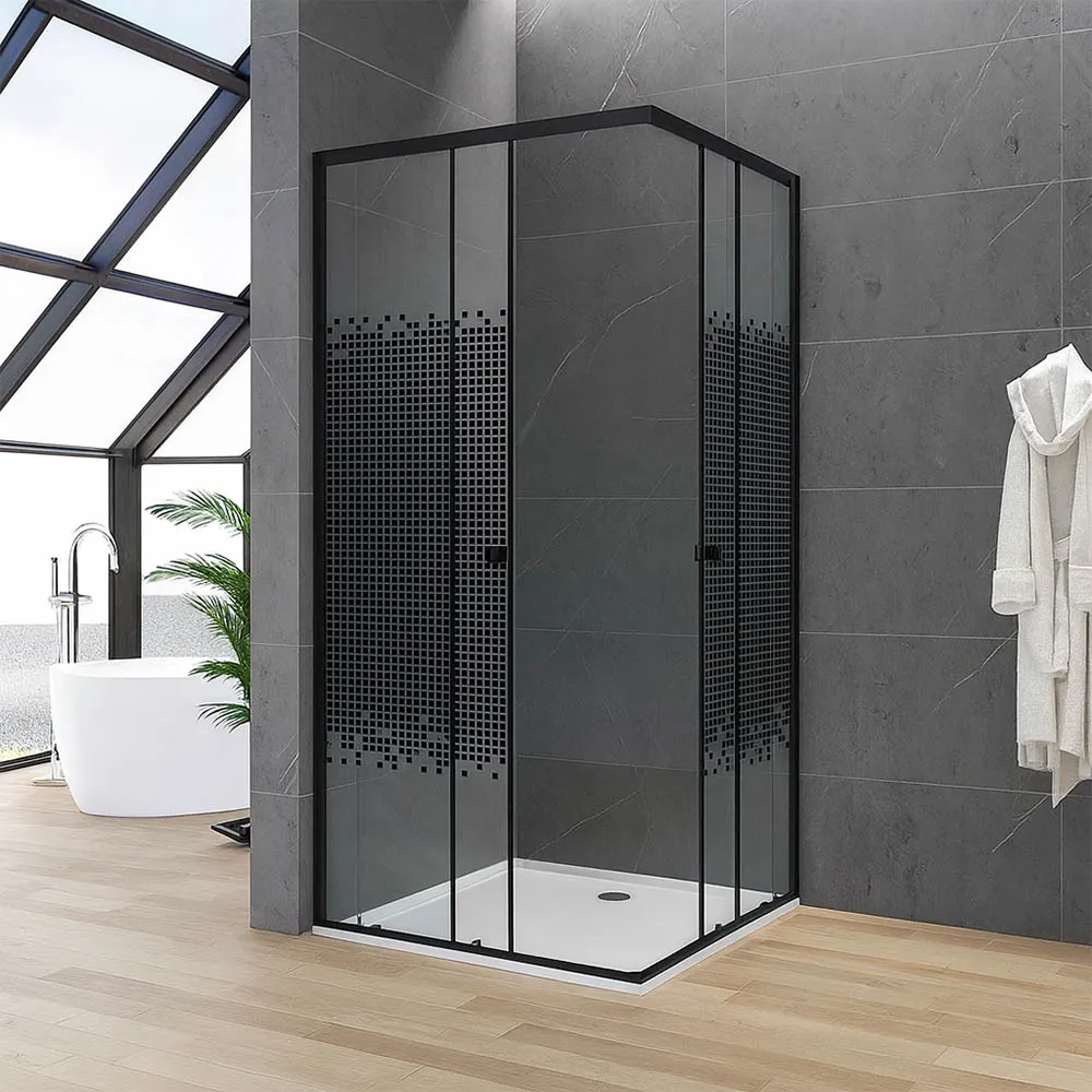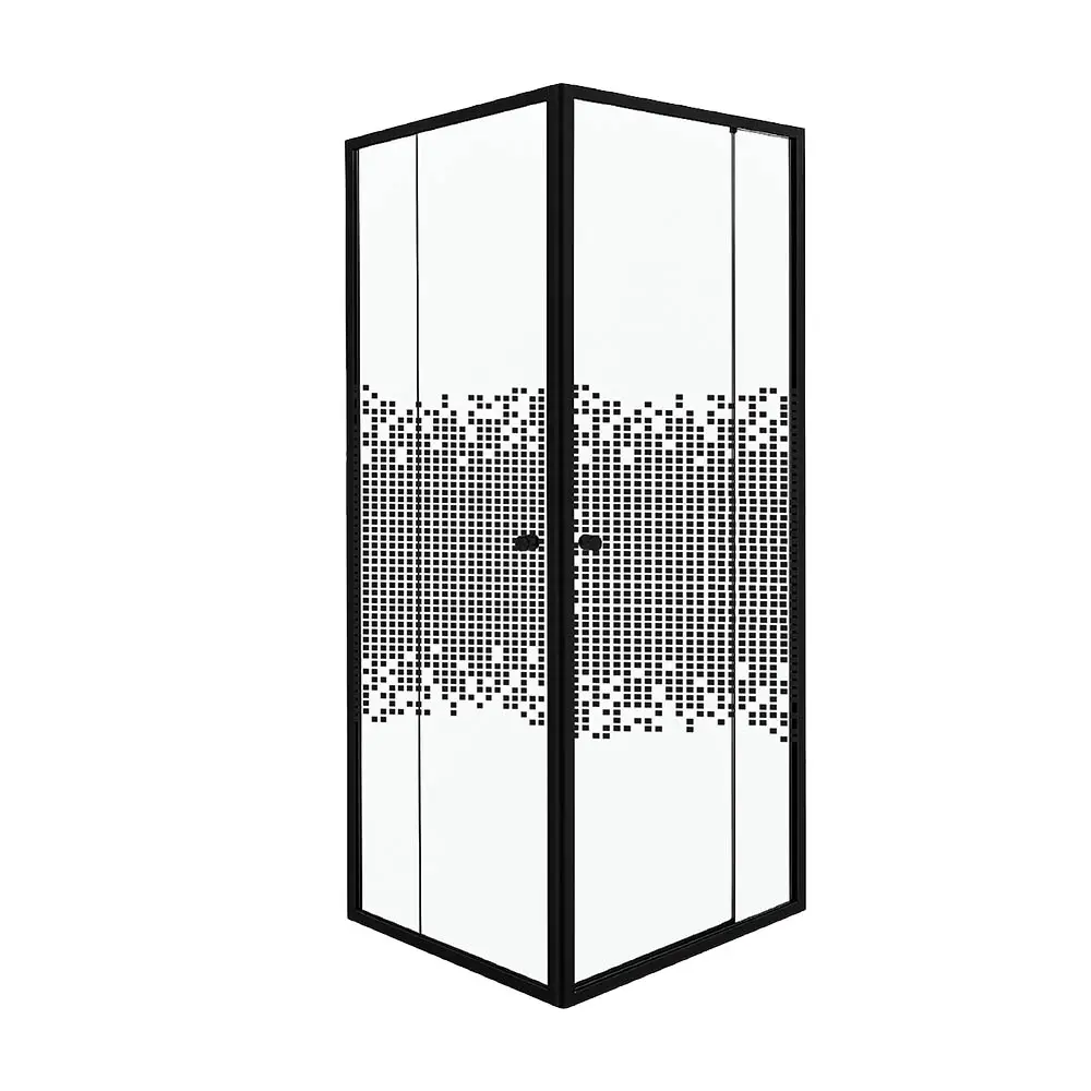 A stylish option for bold interiors, this 900×900×1800mm cubicle features clear glass with black block designs, a strong aluminum frame, and black handles. Perfect for a modern bathroom refresh.