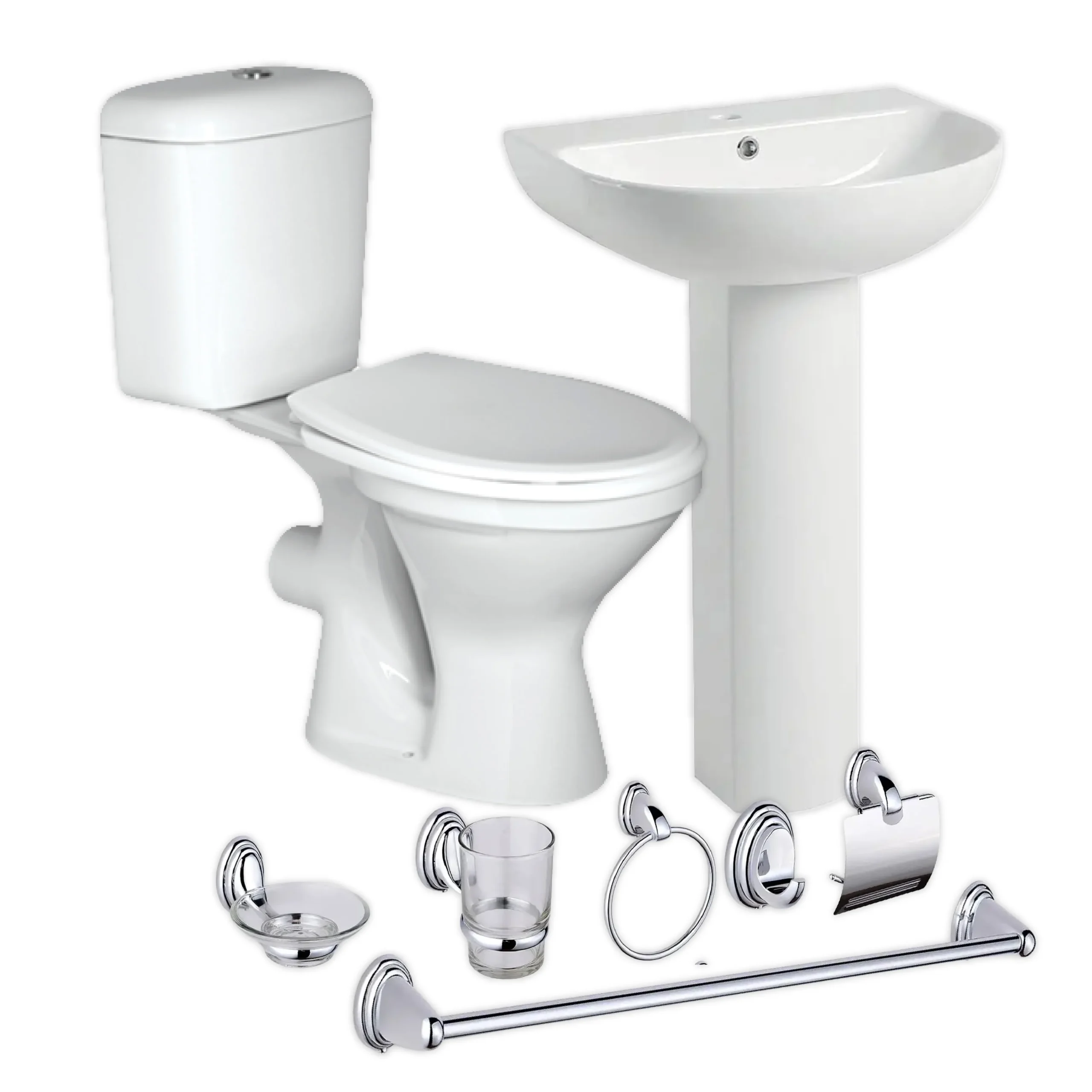 Top flush toilet combo includes a B-Grade close coupled toilet set and a basin & pedestal with a 5 piece bathroom accessory set