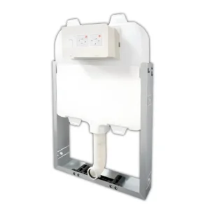 Top flush toilet combo includes a B-Grade close coupled toilet set and a basin & pedestal with a 3 tier wooden shelf